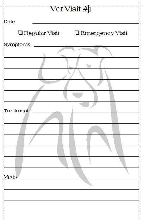 Vet visit logs – guided pages for regular and emergency visits, with space for symptoms, diagnosis, medications, and follow-up notes