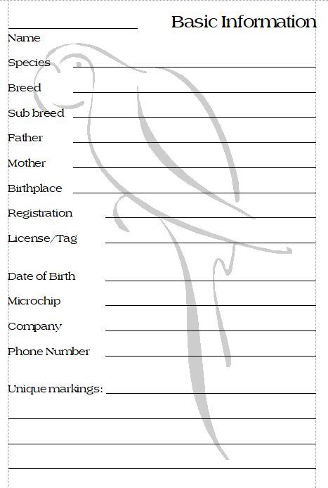 Basic information pages – record your pet’s name, breed, microchip, registration, unique markings, and vet contact details so everything important is in one place